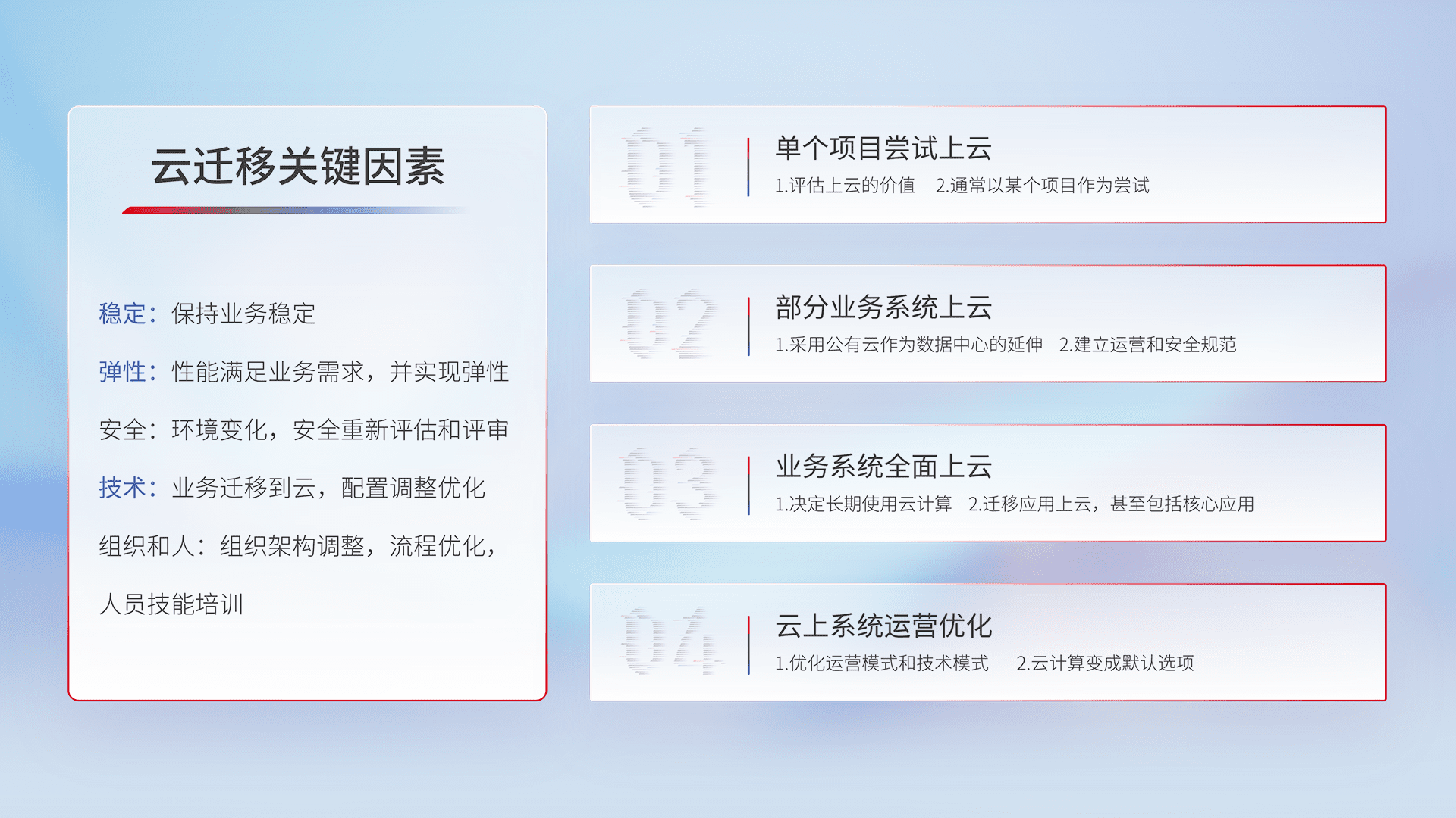 结合实际业务,,从规划设计、、、云平台选型、、云原生改造、、数据迁移、、集成交付,,,,迁移全过程为客户识别最佳上云路径,,,,做好风险识别管理,,,设计网络架构、、、、身份权限、、、安全审计合规、、、操作审计、、、、日志审计、、、、监控告警策略、、多站点容灾设计等,,,,对云上基础设施进行整体规划,,提升IT治理水平,,以满足弹性、、、、高可用、、、高性能的需求。。。。