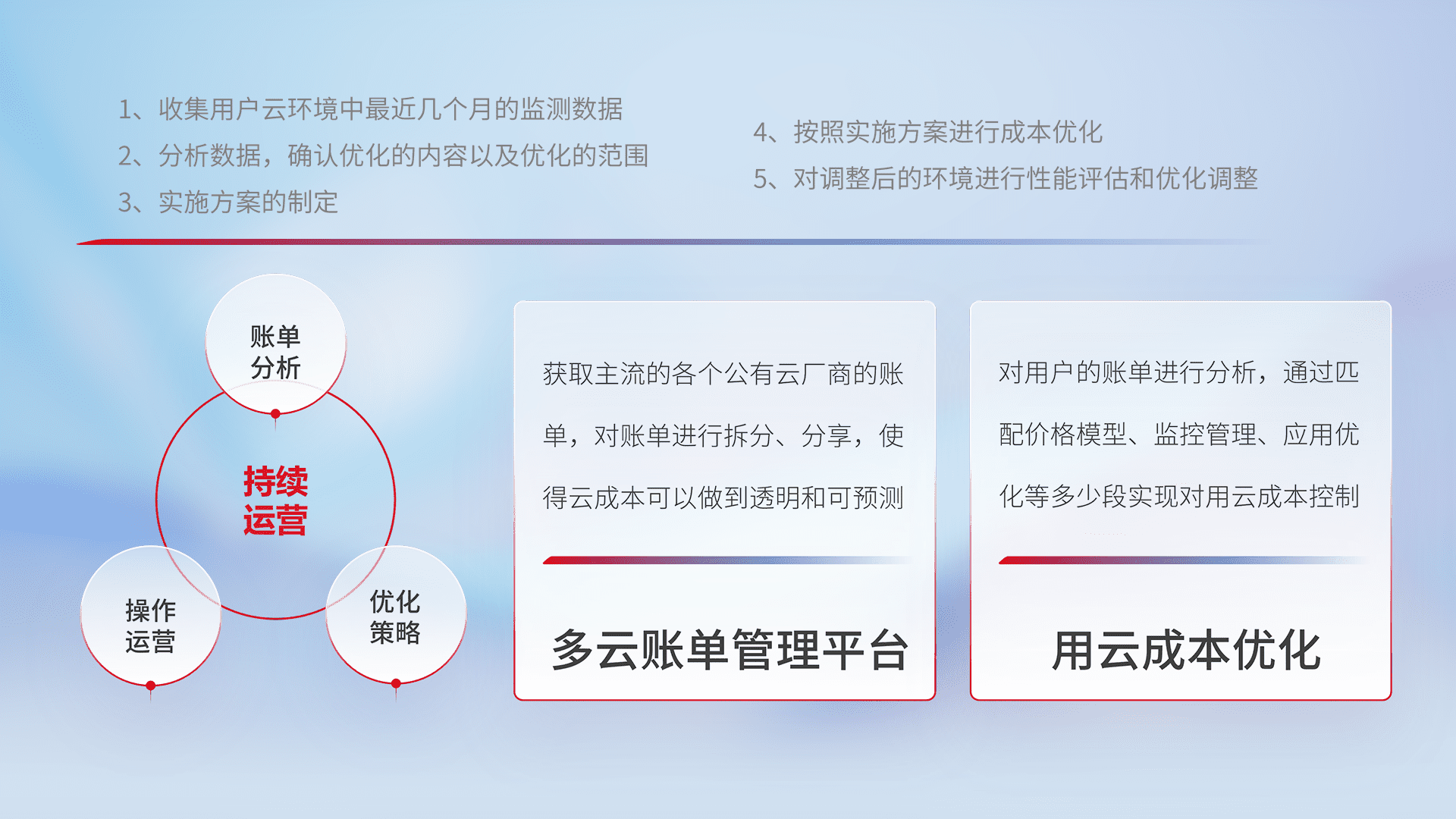 通过多云纳管,,,以统一的资源数据模型把客户的云资源进行抽象和封装,,,进而实现对多云资源的统一操作,,,,保障云资源管理的可靠性、、、稳定性与可用性。。量身定制化运维内容,,,,配置、、、开发运维、、补丁管理、、、、备份、、监控、、、认证和访问管理、、审计和日常巡检等,,,,保障在用云过程中的可靠度,,,稳定度以及高可用率。。