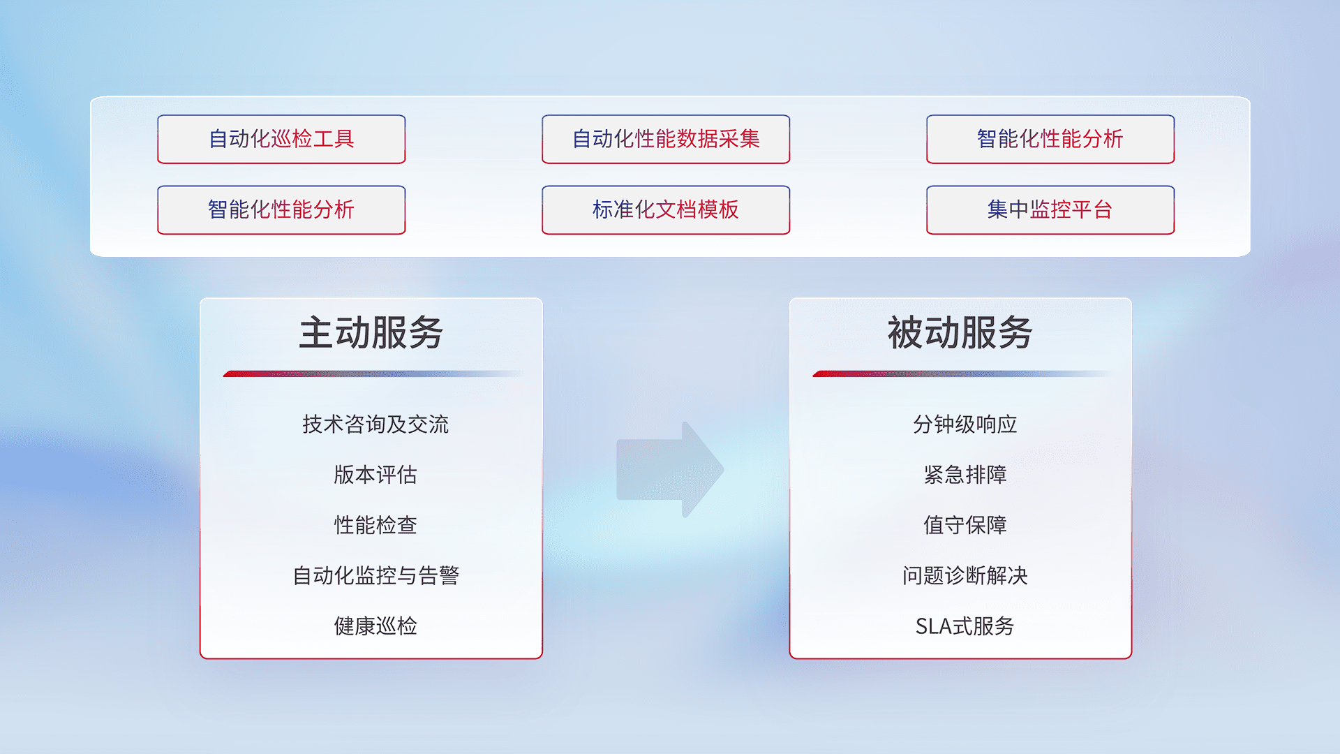 智能化工具和标准化文档,,保障服务质量,,提供主动服务(包含技术咨询、、版本评估、、性能检查、、自动化监控与告警、、、健康巡检)和被动服务包含(分钟级响应、、、紧急排障、、、、值守保障、、、、问题诊断解决、、、SLA服务)。。。